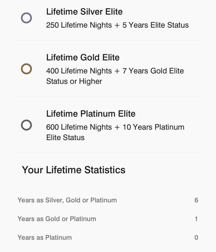 lifetime status Lifetime Status Next Tier: Lifetime Silver Elite About Lifetime Awards Enjoy what you've earned —for life. Your points never expire and you'll get all of your current lifetime tier benefits forever. Achieving Lifetime Status Got it, Thanks